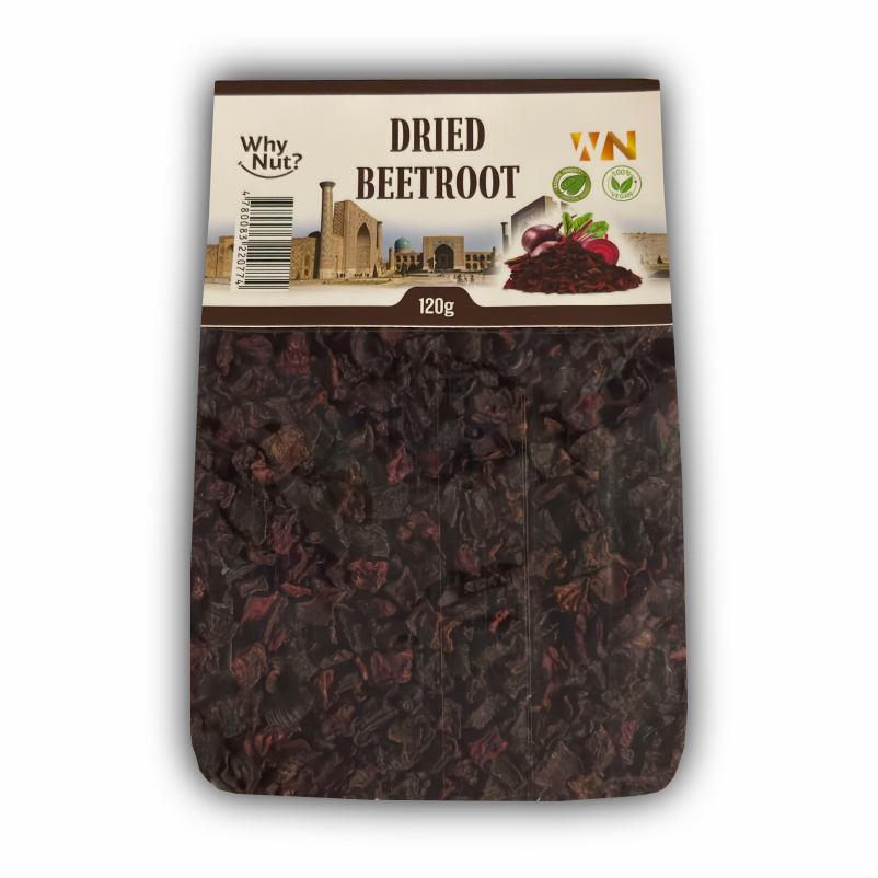 INFORMACIJE O PROIZVODU: WhyNut suha cvekla ima malo kalorija i izuzetno je bogata vitaminom C i drugim antioksidansima, što je čini odličnim dodatkom zdravoj prehrani.Cvekla je veoma svestran sastojak koji se može koristiti na različite načine u kuhinji kao dodatak jelima i za pravljenje umaka (humusa) i namaza.