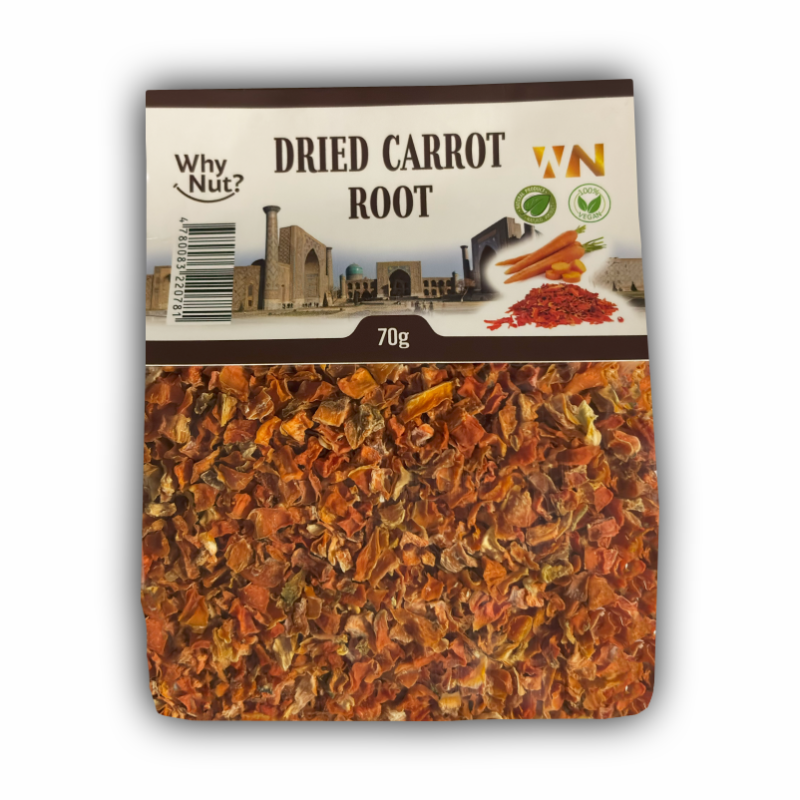 INFORMACIJE O PROIZVODU: WhyNut sušena mrkva sadrži sve hranjive sastojke koje su sadržane u svježoj mrkvi, vitamine A, C i β-karoten, te štedi vrijeme guljenja, rezanja i sjeckanja.Od naše sušene mrkve možete napraviti ukusnu supu, variva, sos, nadjev,    tjesteninu ili je koristiti u salatama.